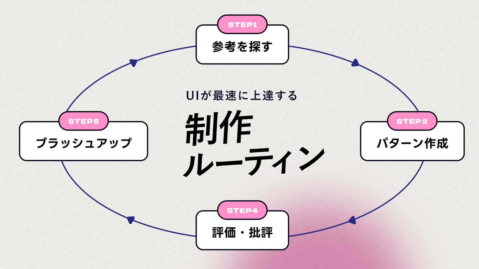 デザインを検討して質を上げていくための進め方、超基本です。必ずこの通りにデザインを進めることで、論理的にデザインを説明できる力や造形力が身につきます